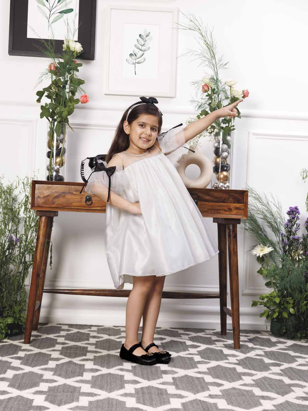 A timeless statement in white, this luxury dress features a graceful sheer neckline and sparkling crystal embellishments that add a touch of brilliance. Chic black bows lend a classic contrast, making the design both playful and sophisticated. Perfect for elegant occasions, this dress blends charm and couture with every detail.