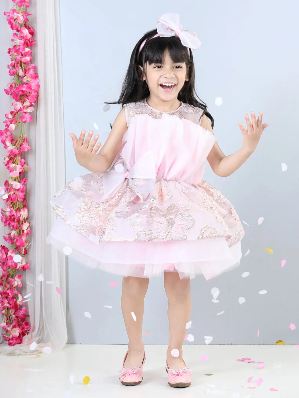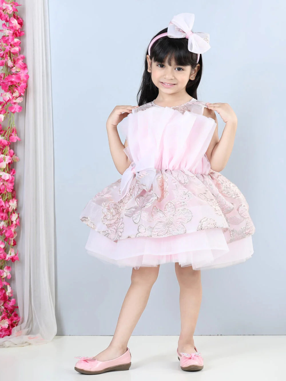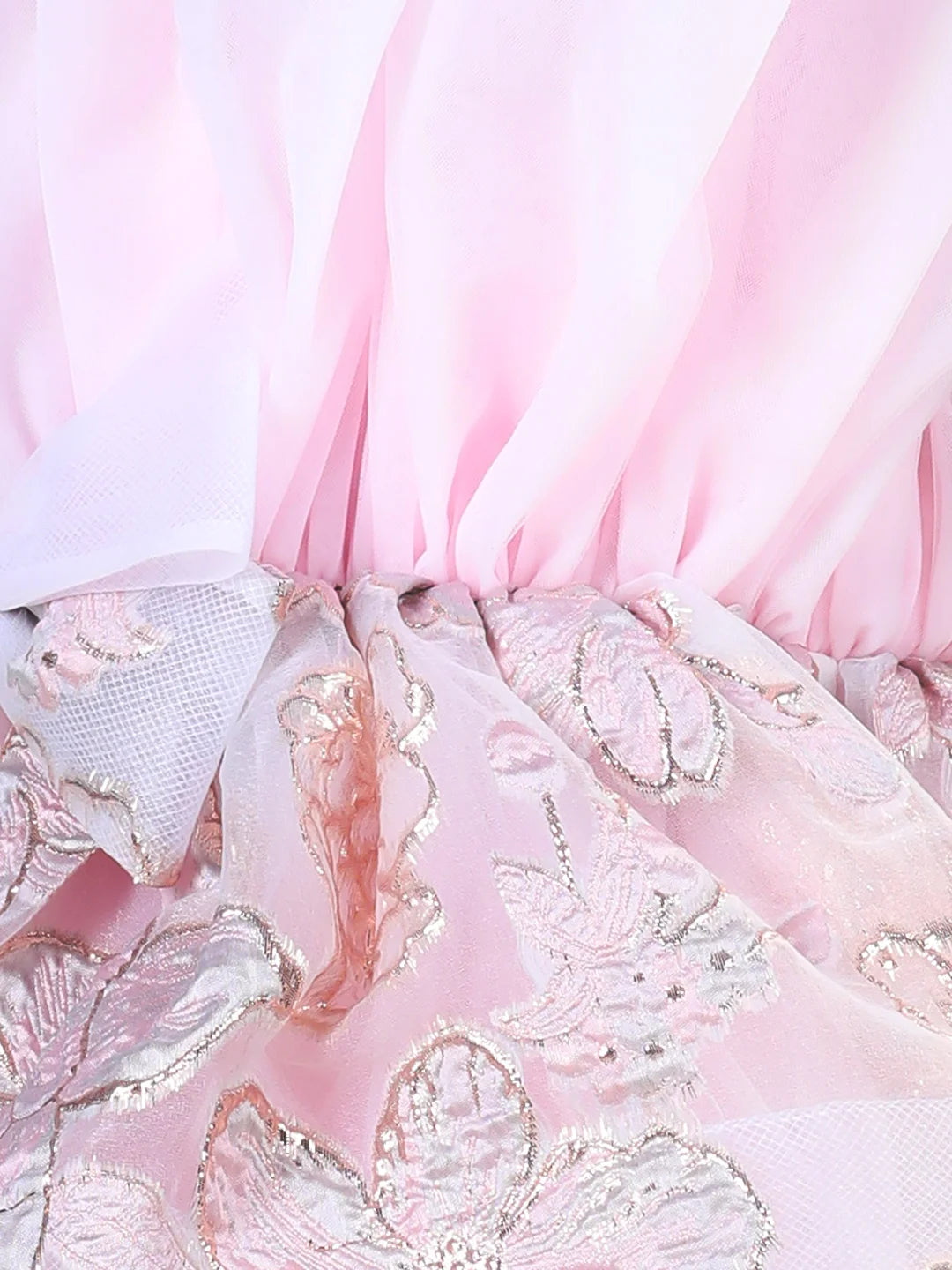 Make them feel like royalty with this exquisite jacquard dress that showcases a chic horsehair hem and picture-ready flair. The bodice features paperbag style with pink tulle alonwith dual bow at the waist. She will surely feel on top of the world and will love you to the moon and back!