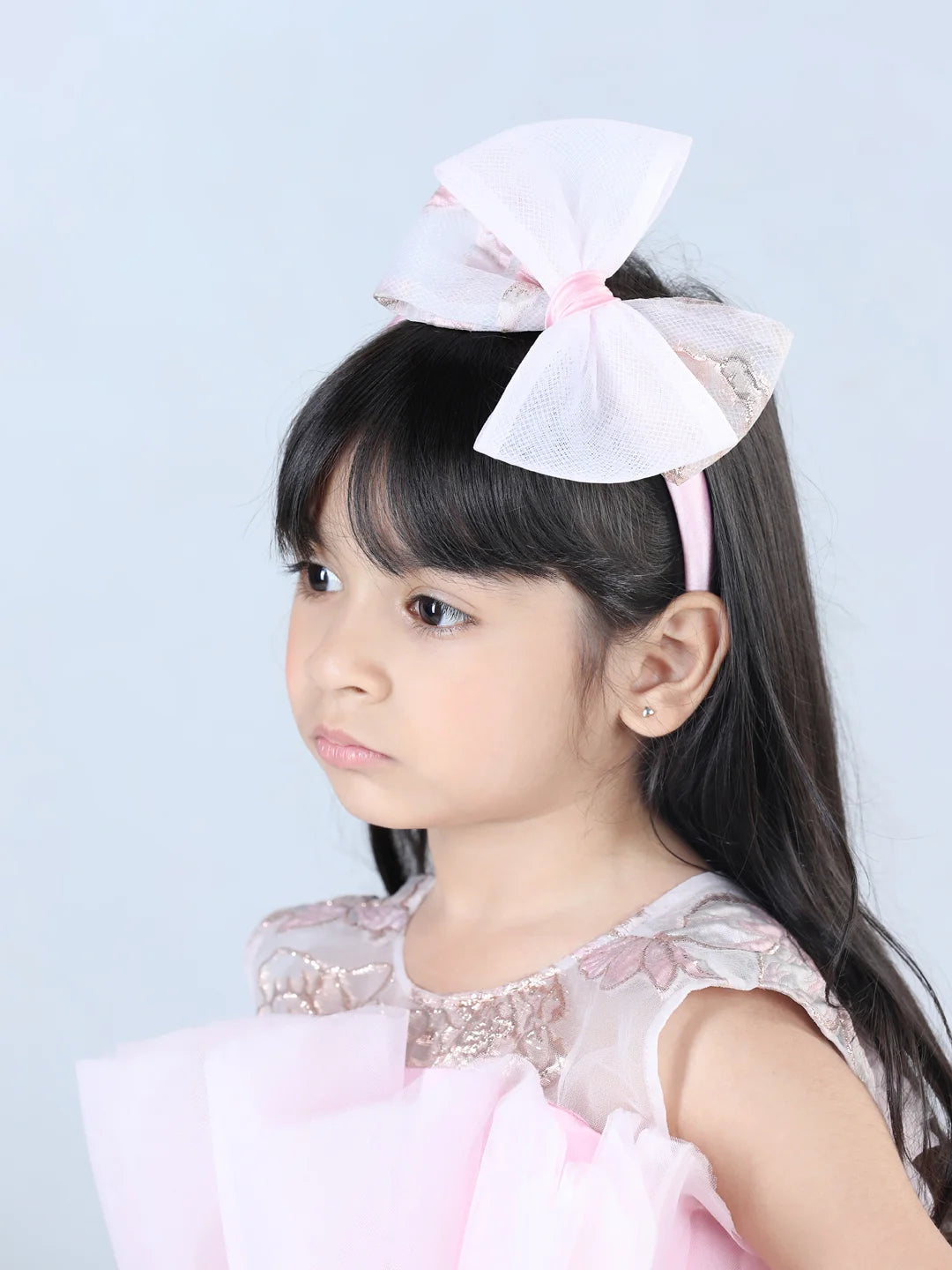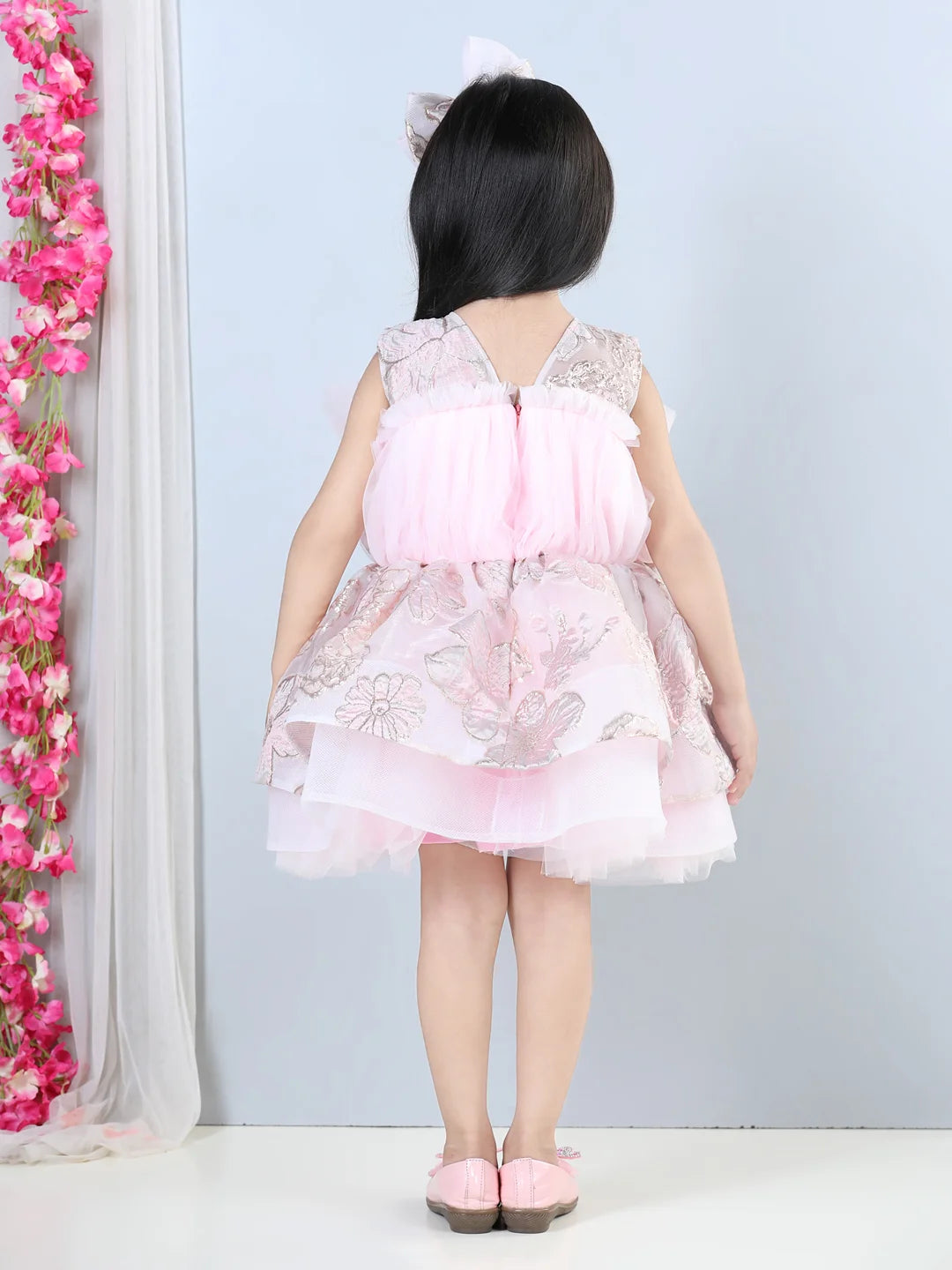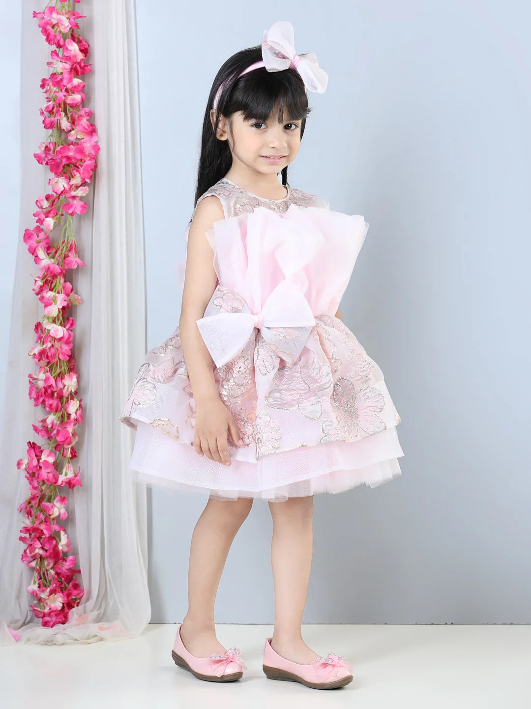 Make them feel like royalty with this exquisite jacquard dress that showcases a chic horsehair hem and picture-ready flair. The bodice features paperbag style with pink tulle alonwith dual bow at the waist. She will surely feel on top of the world and will love you to the moon and back!