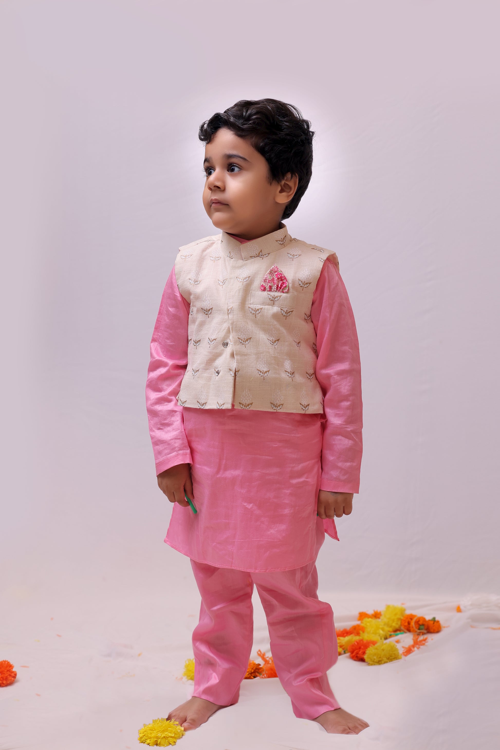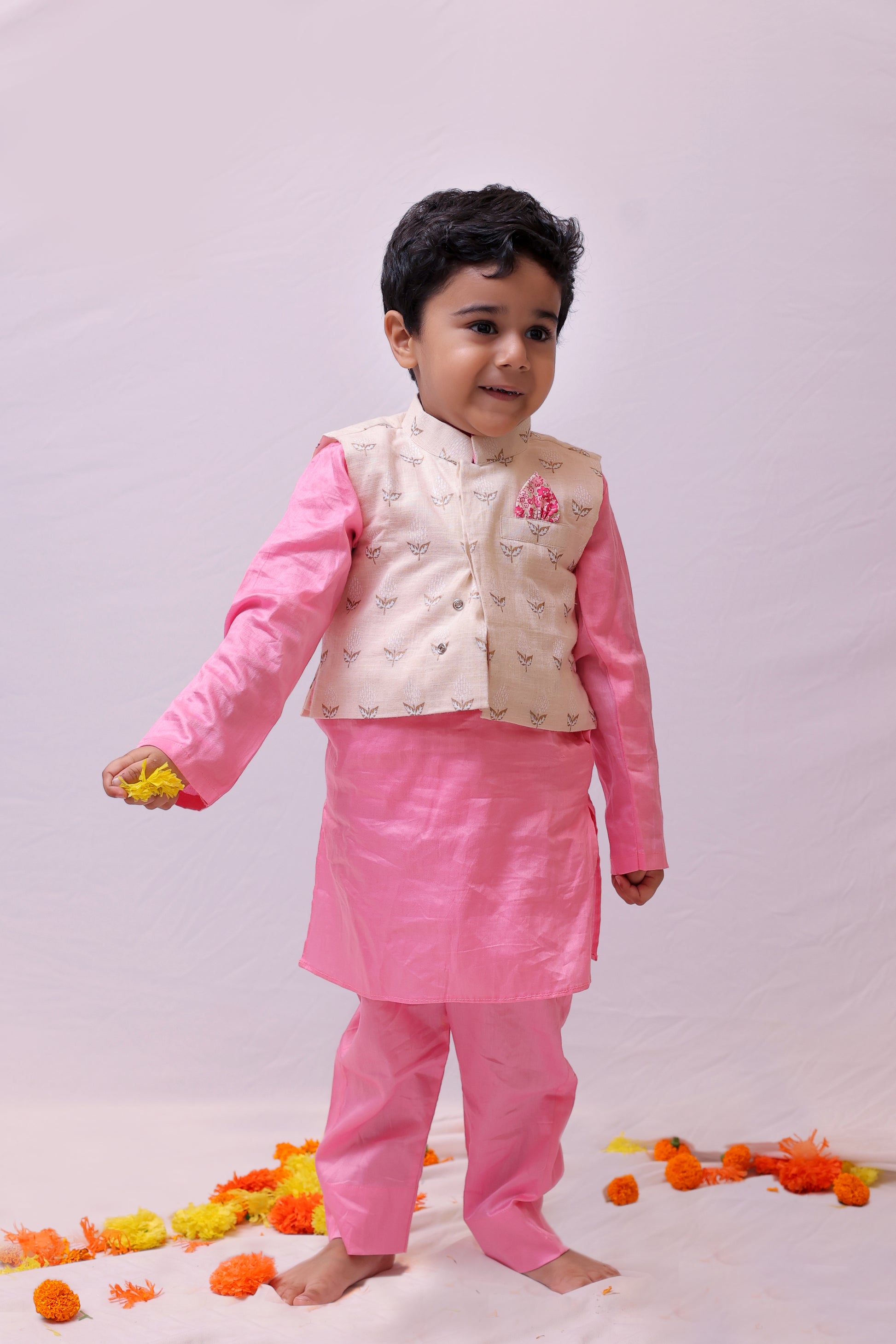 Add a touch of elegance to your little one's wardrobe with this Pink Nehru Jacket Set. The set features a vibrant pink kurta paired with a cream Nehru jacket adorned with subtle floral embroidery. Perfect for festive celebrations or family gatherings.