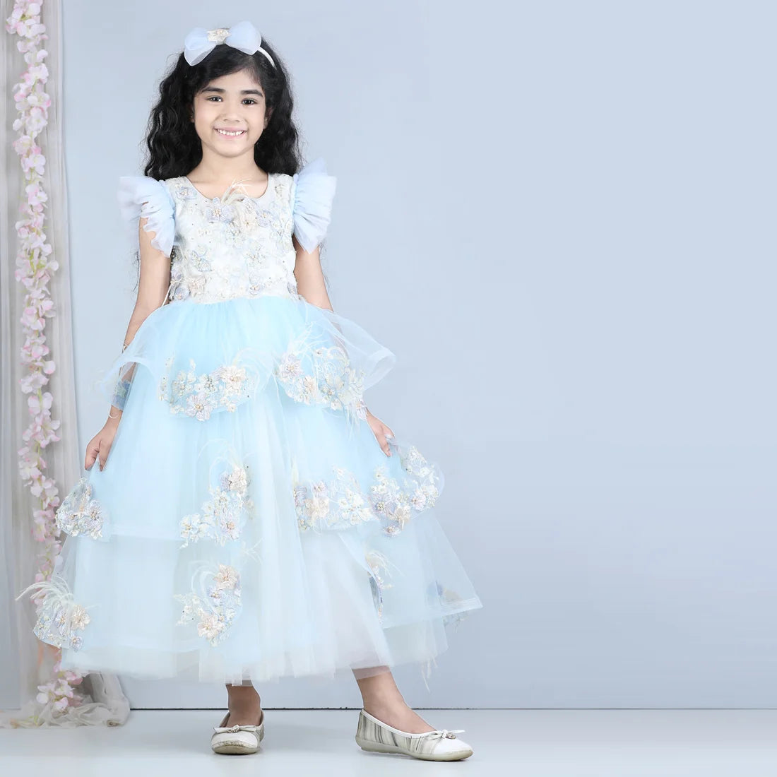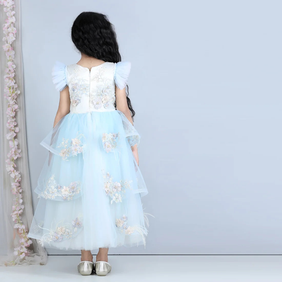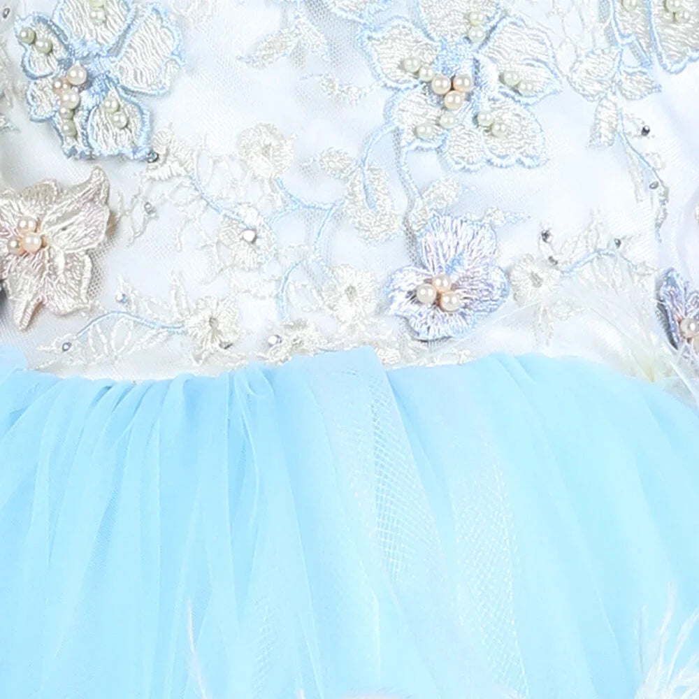 Make magical memories that last a lifetime with our enchanting Meghan dress in off white and blue. Designed to embody grace and sophistication, this dress will fill your special day with joy and wonder, ensuring your little one looks and feels like a true princess. The bodice is carefully hand crafted with flower embroidery, beads and feathers with small frill sleeves making sure that each detatil is comfortable for your little one. Structured horsehair trim in 3 layers with flowers, beads and feathers turns the tulle skirt of this lace-bodice dress into a poofy and whimsical dream. The dress is fully cotton lined for added comfort.