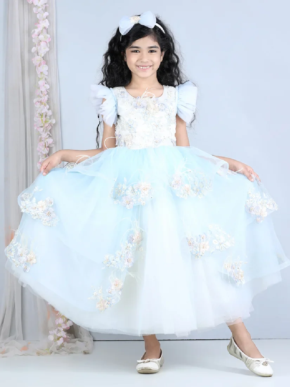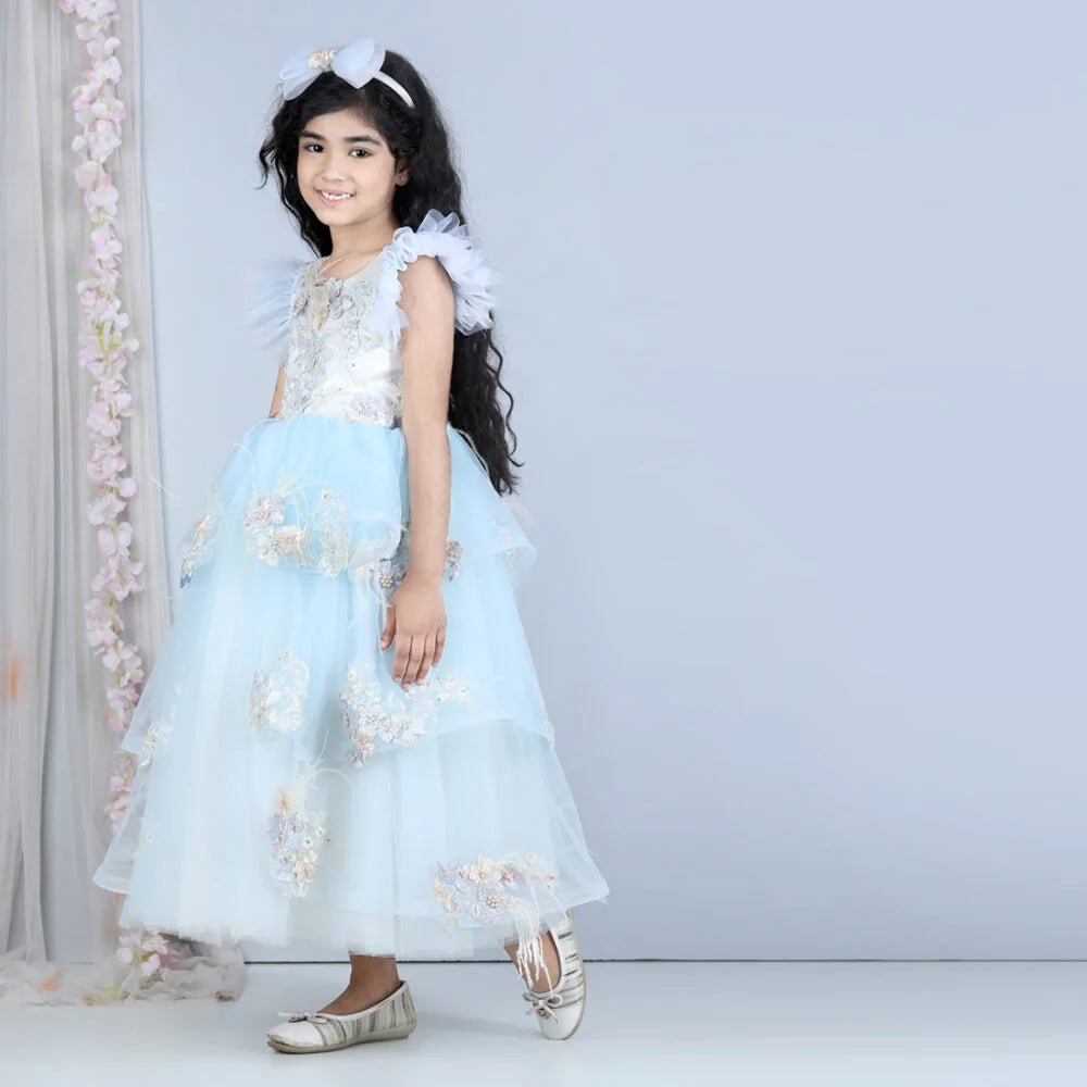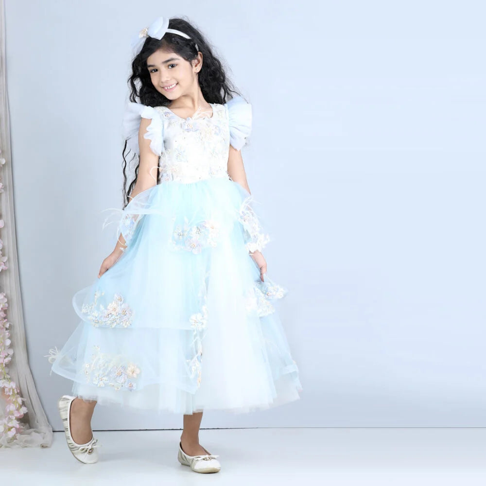 Make magical memories that last a lifetime with our enchanting Meghan dress in off white and blue. Designed to embody grace and sophistication, this dress will fill your special day with joy and wonder, ensuring your little one looks and feels like a true princess. The bodice is carefully hand crafted with flower embroidery, beads and feathers with small frill sleeves making sure that each detatil is comfortable for your little one. Structured horsehair trim in 3 layers with flowers, beads and feathers turns the tulle skirt of this lace-bodice dress into a poofy and whimsical dream. The dress is fully cotton lined for added comfort.