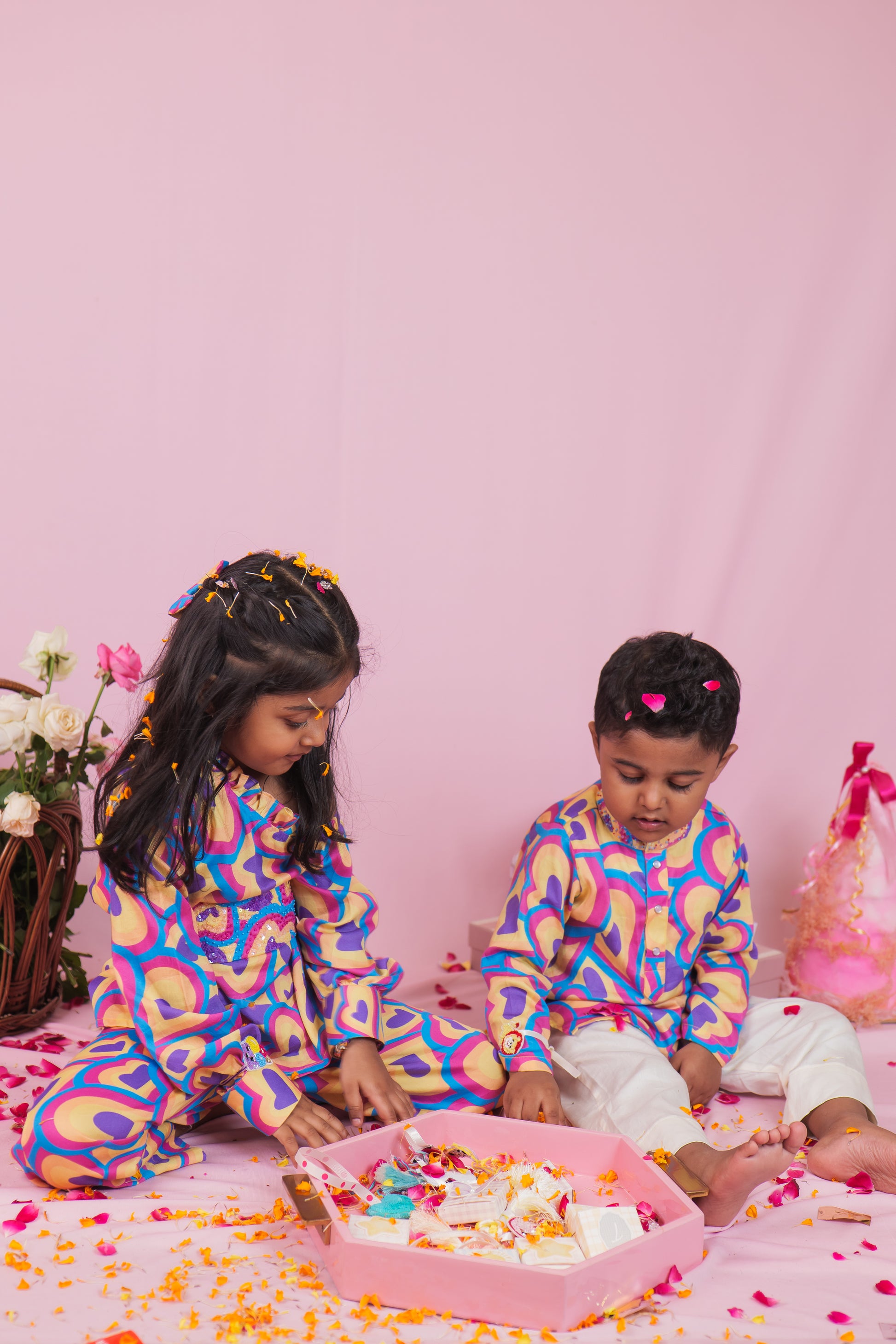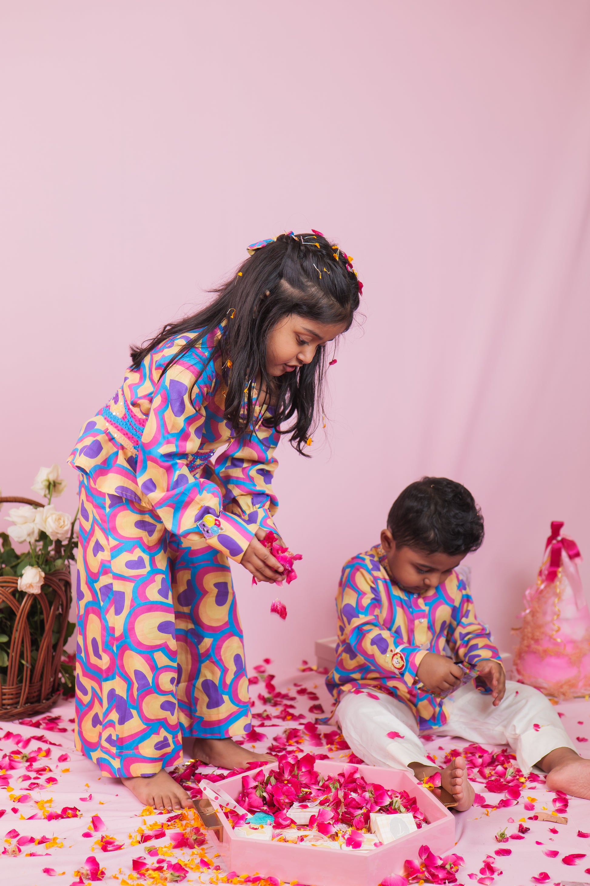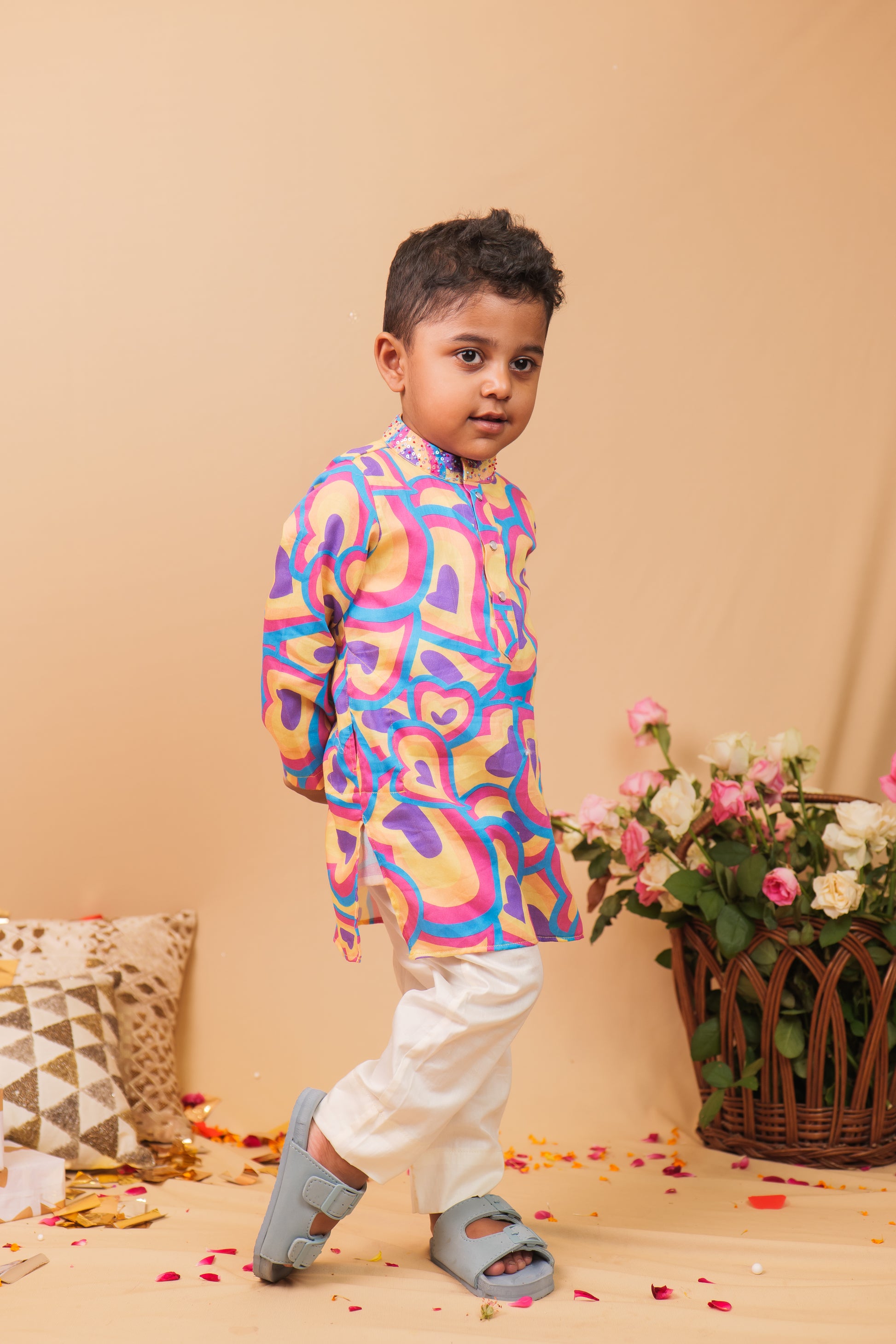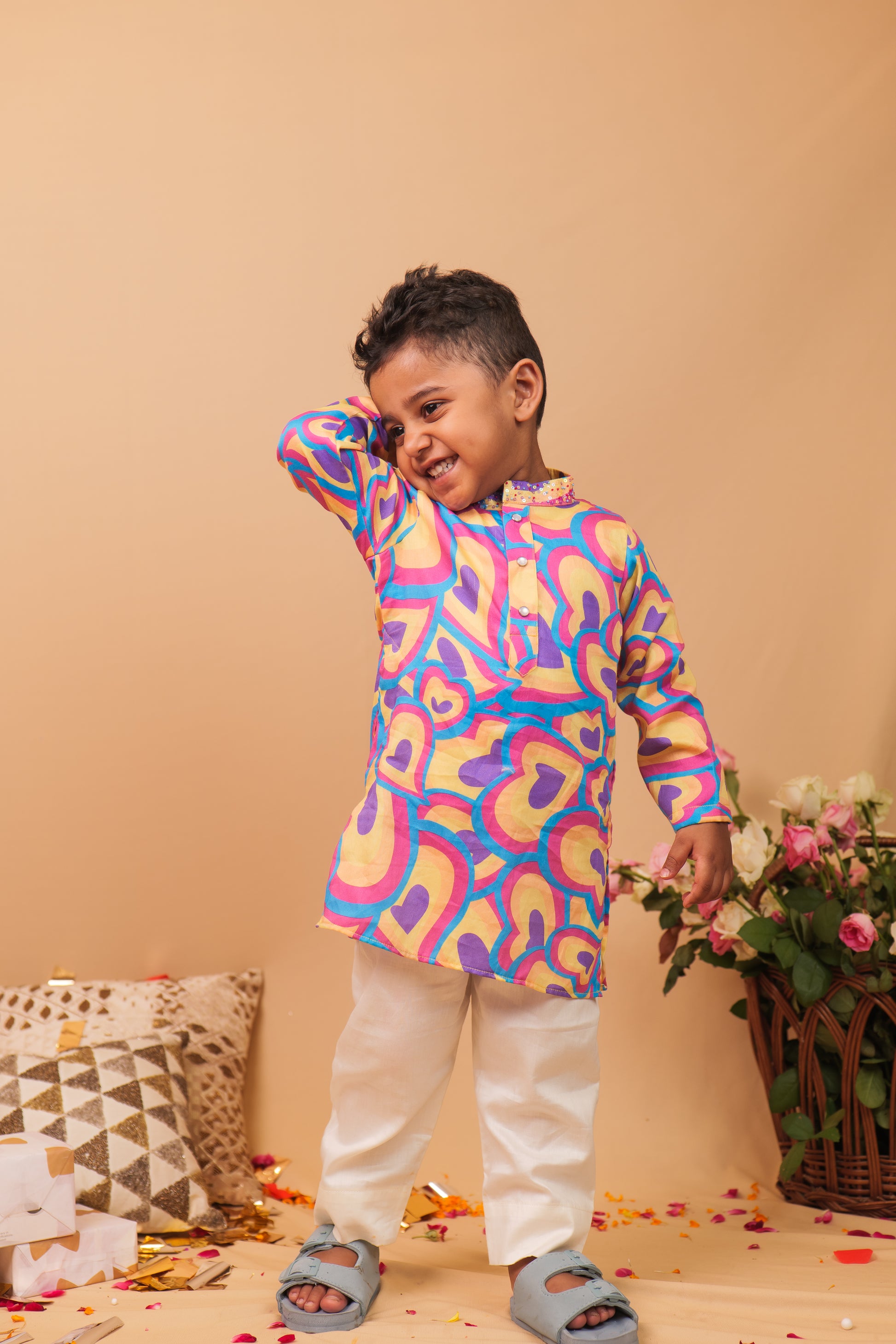 Bright, bold, and full of love! This cheerful boys' cotton kurta pyjama set is perfect for your little one’s happy days. The kurta features multicolored heart prints in shades of blue, pink, yellow, and purple, creating a fun and lively look that’s sure to stand out.