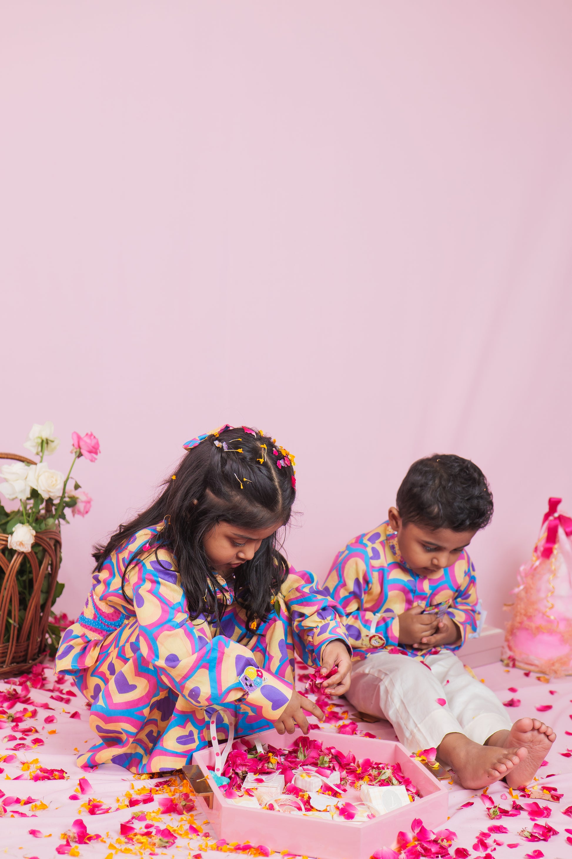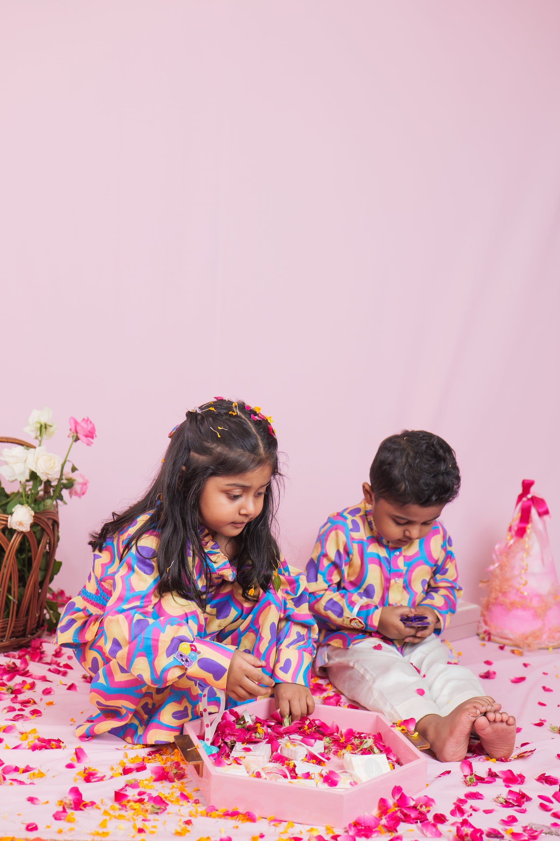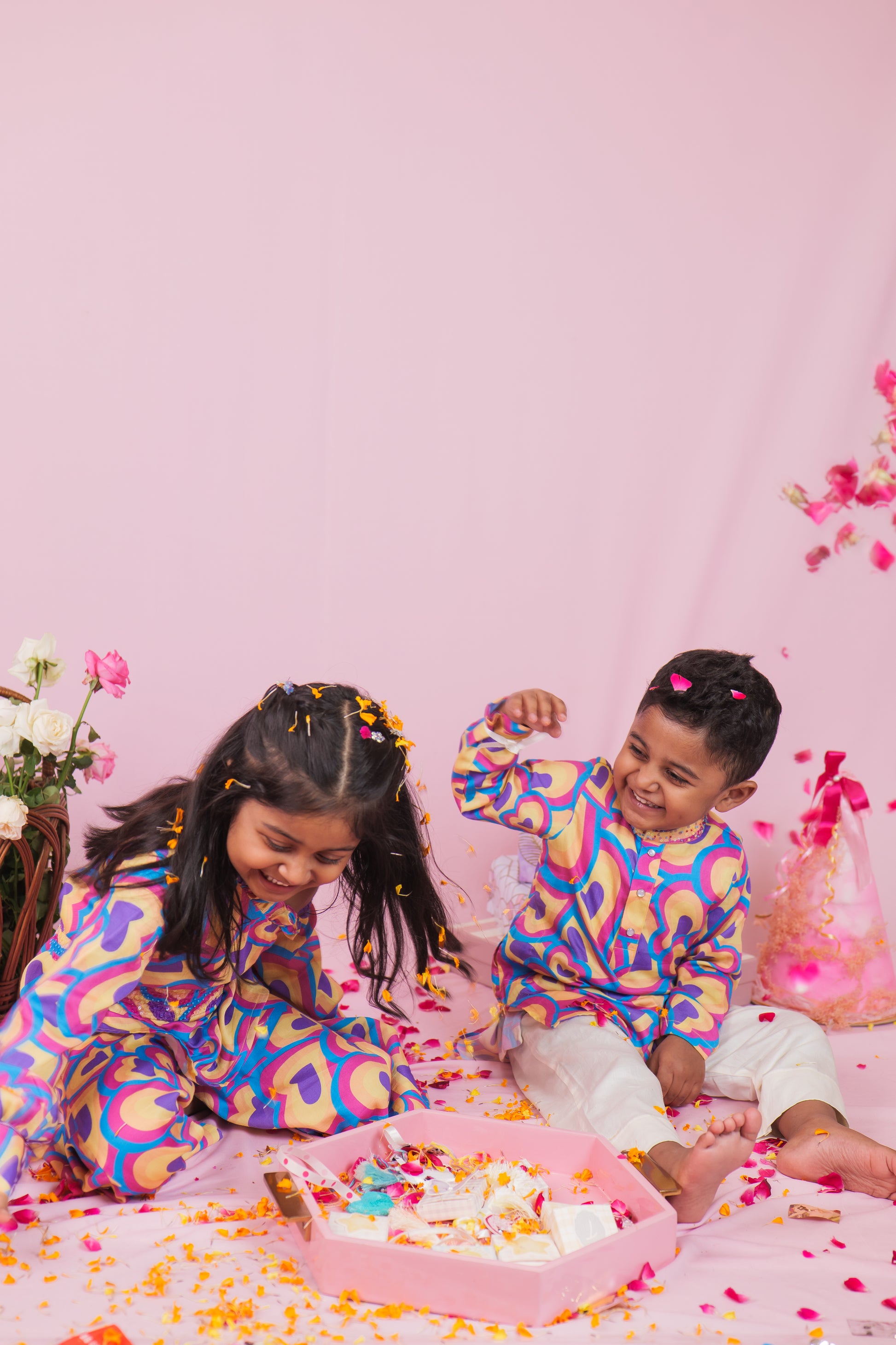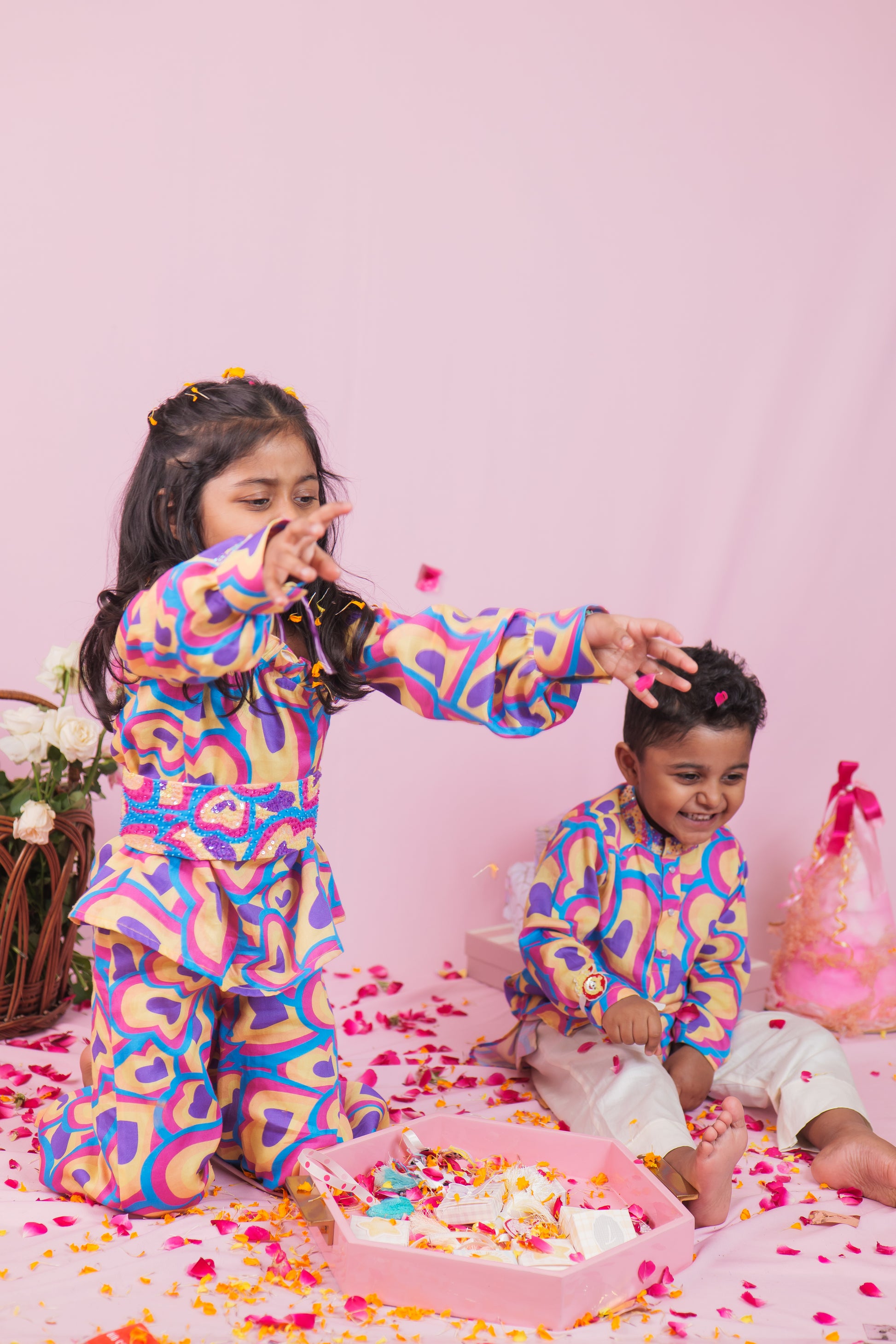 Bright, bold, and full of love! This cheerful boys' cotton kurta pyjama set is perfect for your little one’s happy days. The kurta features multicolored heart prints in shades of blue, pink, yellow, and purple, creating a fun and lively look that’s sure to stand out.